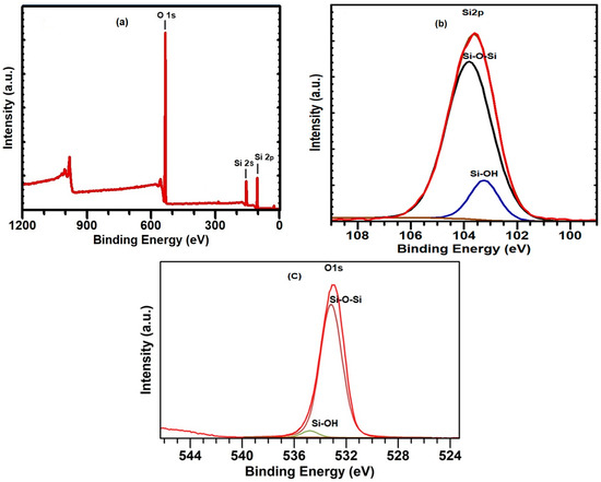 XPS spectra of the SiO2 xerogel sample: (a) full spectra; (b) Si2p spectra; and (c) O1s spectra.