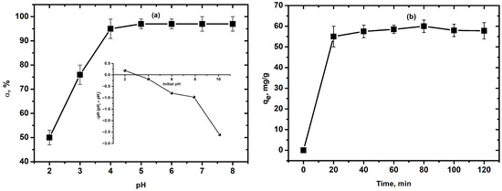 (a) Effect of solution pH on the Cu2+ removal efficiency by adsorption onto SiO2 xerogel sample (C0 = 300 mg/L, T = 25 °C, time 30 min, and 0.2 g SiO2 xerogel); (b) adsorption capacity of Cu2+ ions as a function of contact time (C0 = 300 mg/L, T = 25 °C, 0.2 g SiO2 xerogel, and pH = 5).