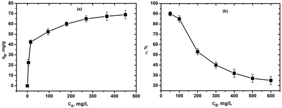 The copper (II) content in the solution was determined via copper (II) complexes with ammonia using a photometric colorimeter SF-2000 (Biomer, Krasnoobsk, Russia) [73]. The adsorption capacity (qe, mg/g) was calculated using Equation (1) and the percentage removal (α, %) using Equation (2):