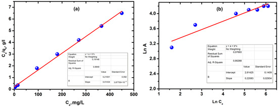 (a) The Langmuir isotherm plots for the adsorption of Cu2+ onto SiO2 xerogel; (b) the Freundlich isotherm plots for the adsorption of Cu2+ ions onto SiO2 xerogel (C0 = 300 mg/L, T = 25 °C, time 80 min, 0.2 g SiO2 xerogel, and pH = 5).