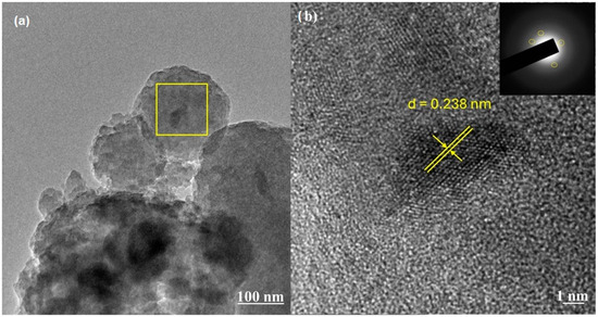 Elemental mapping of the SiO2 xerogel sample (Figure S4) and energy-dispersive spectra (Figure S4b) shows the adsorption of Cu2+ ions on the surface of the sorbent. The obtained data allow for a qualitative assessment of Cu2+ adsorption. For a more detailed understanding of the sorption mechanism and processes occurring on the surface of SiO2 xerogel, images of the surface of the adsorbent particles after adsorption were obtained. TEM images of the SiO2 xerogel sample after adsorption are presented in Figure 7. As can be seen from the obtained data, darker areas in the images correspond to copper ions and their compounds formed on the surface of SiO2 (Figure 7a). The highlighted area of the sorbent shows the formation of copper compounds with a crystalline structure on the surface of the xerogel (Figure 7b).