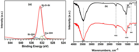 (a) XPS O1s spectra of the SiO2 xerogel sample after Cu2+ sorption; (b) IR spectra of SiO2 xerogel samples before (1) and after (2) adsorption under optimal conditions (C0 = 300 mg/L, T = 25 °C, time 80 min, 0.2 g SiO2 xerogel, and pH = 5).