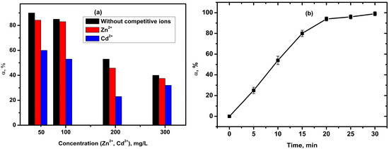 The experimental data presented in Figure 9a indicate that Zn2+ ions do not significantly affect Cu2+ adsorption under the investigated concentrations, with only a slight decrease observed in the percentage of adsorbed Cu2+ ions. In contrast, Cd2+ ions exhibit a more pronounced effect on Cu2+ removal compared to Zn2+. The adsorption efficiency of copper ions decreases noticeably in the presence of Cd2+, and this effect is observed at lower initial concentrations of copper ions. Notably, at a Cd2+ concentration of 200 mg/L, the removal rate of Cu2+ was reduced by half.