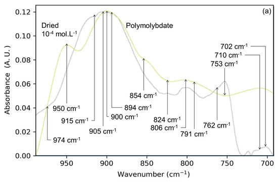 The band at 748 cm−1 in the solid/solution interface (Figure 3a) is due to a particularly stable molybdate surface complex. Hence, it is surprising to see the absence of a signal at ca 748 cm−1 while the saturation of the surface by the monomolybdates should leave a higher amount of them at the surface and a positive band in the associated IR spectrum. This band overlaps with a bending mode of surface hydroxyls and the molybdate adsorption should leave a negative band as mentioned earlier. As neither a clear negative band nor a clear positive band are noticed, and as several species are active in the 710 to 775 cm−1 range, this region is left out of the analysis.
