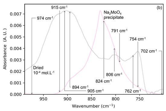 Another possible product of the accumulation of solute is a precipitate of sodium monomolybdate (Na2MoO4). Figure 1b shows the spectrum of the Mo-4 interface with the spectrum of a precipitate of sodium molybdate obtained by drying a solution in similar conditions (pH 8, NaCl 0.01 mol⋅L−1). The spectra of the Mo-4 interface and Na2MoO4 precipitate differ in terms of IR maxima (830 cm−1 for the precipitate and 905 cm−1 for the dried interface) and overall shapes. These observations suggest that sodium molybdate precipitate is not prevailing at the surface of the lepidocrocite upon drying of the solid/solution interface. The differences in IR signals are summarized in Table 1.
