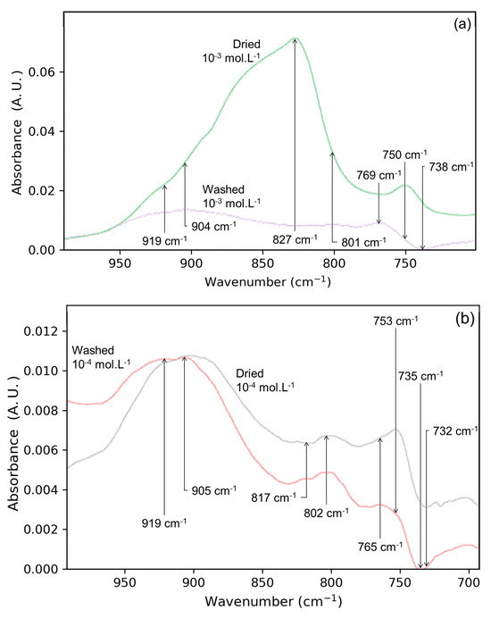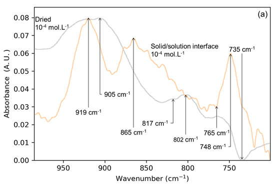In order to highlight the modifications brought by the washing step, the spectra of the dried solid/solution interface before and after washing step are compared in Figure 2. For the Mo-3 interface (Figure 2a), the signals significantly changed after washing, while the shape and intensity of the bands of the Mo-4 interface are not significantly impacted. Thus, the wide intense band at ca. 827 cm−1 disappeared in the Mo-3 experiment, revealing a low intensity spectrum with bands previously not visible. This is consistent with the presence of a large number of OS complexes at the surface after simple drying. Moreover, the wavenumbers of these newly observed bands are close to those obtained after the drying and washing of the Mo-4 interface.