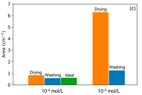 Superimposed spectra of (a) Mo-3 interface dried (red) and washed/dried (green), (b) Mo-4 interface dried (red) and washed/dried (blue) as well as (c) histogram of band areas after drying (orange) and washing/drying (blue) for interfaces Mo-4 (left) and Mo-3 (right). The green bar on the left side shows the ideal dilution of the surface concentration, which is one tenth of the band area measured for Mo-3 interface.