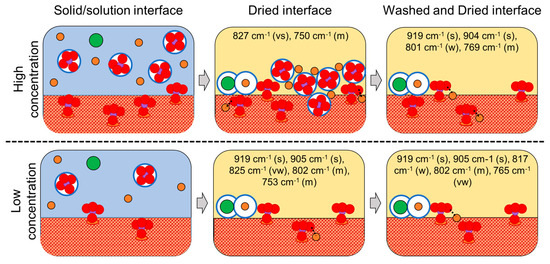 Summary of the drying and washing/drying of the solid/solution interfaces of molybdates on lepidocrocite at high and low concentrations. Purple circles are Mo ions (associated with red oxygen atoms), orange sodium ions, and green chloride ions. The white circles with blue borders represent solvation spheres. Main bands are indicated for both interfaces before and after washing. Intensities (in parentheses): very strong (vs), strong (s), medium (m), weak (w), very weak (vw).