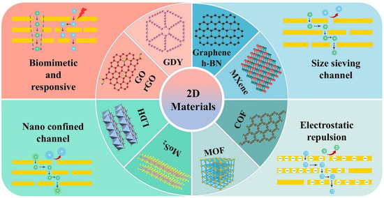 Over the past two decades, significant advancements have been made in material synthesis methodologies. Emerging materials such as metal–organic frameworks (MOFs) [7], covalent organic frameworks (COFs) [8], carbon-based materials (e.g., graphene and graphdiyne) [9,10,11], MXenes [12], and layered double hydroxides (LDHs) [13] have become prominent research frontiers in membrane science. The rapid development in membrane chemistry has laid the foundation for precise control over pore dimensions and channel functionality [14,15]. It has established new paradigms for constructing confined transport environments, developing innovative transport mechanisms, and ultimately overcoming the pervasive trade-off effect between permeability and selectivity [16,17].
