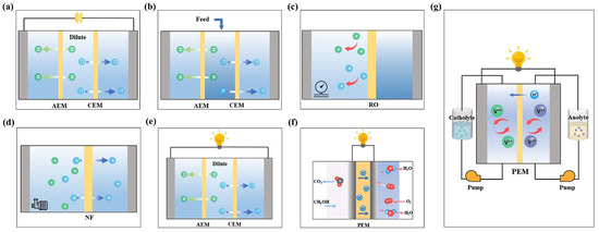 The application of 2D materials. (a) Electrodialysis. (b) Diffusion dialysis. (c) Reverse osmosis. (d) Nanofiltration. (e) Reverse electrodialysis. (f) Direct methanol fuel cell. (g) Vanadium redox flow battery.