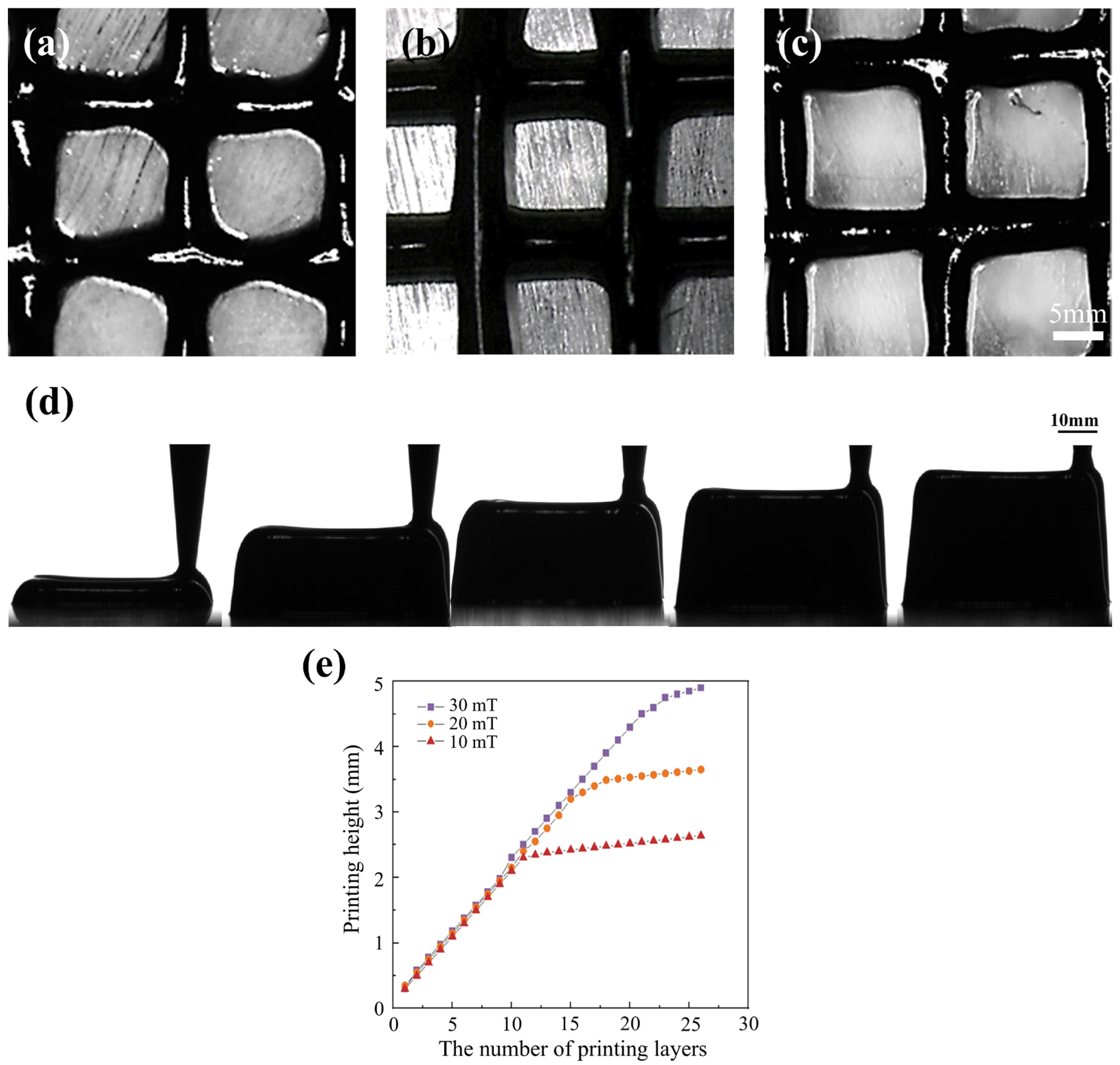 - The 8% bentonite-8% Fe3O4 sample was ultimately identified as having good printability (Pr = 1, corner angle = 90) under the optimal printing parameters, i.e., the combination of the magnetic field strength H = 20 mT, the extrusion head movement speed v = 5 mm/s, and the extrusion head diameter d = 0.4 mm. The final printing quality was also validated.