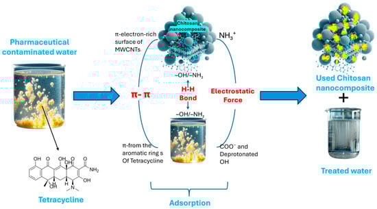 The adsorption of tetracycline by chitosan nanocomposite works through a combination of π–π interactions, hydrogen bonding, and electrostatic forces. Once the adsorbent is added to the contaminated water, tetracycline molecules interact with the surface of the adsorbent through multiple pathways. As shown in Figure 1 on, π–π stacking interactions arise from the alignment of tetracycline’s aromatic rings with the extended π–electron networks present on the carbon-based components of the nanocomposite, such as functionalized multi-walled carbon nanotubes. Functional groups on the chitosan, like -OH and -NH2, engage with the polar functional groups of tetracycline to allow hydrogen bonding. At pH 6, the amino groups in chitosan become protonated, giving the surface a positive charge, while tetracycline predominantly exists in a neutral or mildly negative state. This charge difference facilitates electrostatic attraction.