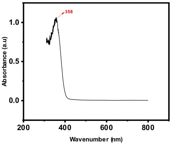 Figure 2 shows the full scan of tetracycline by a UV–Vis spectrophotometer. A UV–Vis scan of tetracycline was performed in the range of 300 to 800 nm at a scan rate of 3600 nm/min to determine the optimal wavelength for its maximum absorbance. We found 358 nm to be the best wavelength for the analysis of tetracyclines using a UV–Vis spectrophotometer, and it was used for the rest of the study. This peak (Figure 2) arises from the molecular structure of tetracycline, which includes conjugated systems, such as aromatic rings and double bonds, that absorb ultraviolet (UV) light. At this specific wavelength, the compound experiences electronic transitions, enabling accurate detection by spectrophotometry [].
