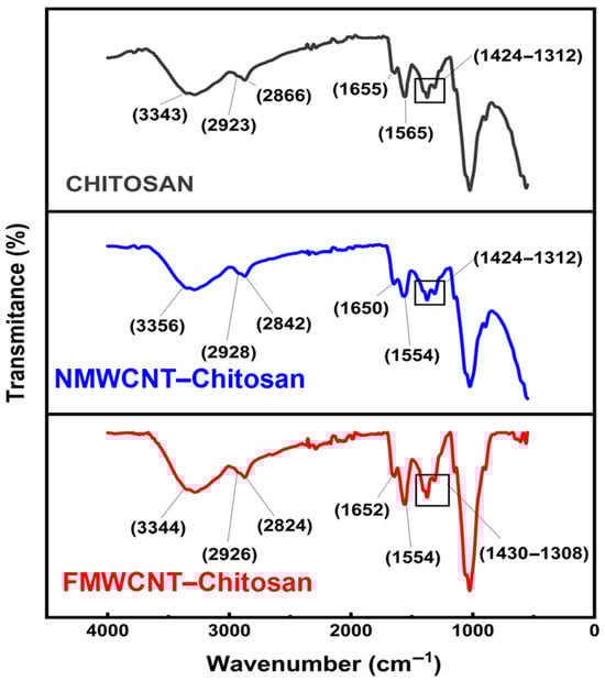 The FTIR spectra of chitosan, FMWCNT–chitosan, and NMWCNT–chitosan nanocomposites are provided in Figure 3. All samples show broad and intense absorption bands in the 3200–3600 cm−1 range, attributed to overlapping stretching vibrations of -OH and -NH2, which are characteristic of chitosan and consistent with its hydrophilic nature []. In the FMWCNT–chitosan and NMWCNT–chitosan spectra, these peaks are further broadened, indicating the incorporation of functionalised MWCNTs rich in hydroxyl group []. Distinct C–H stretching vibrations are observed in the region of 2923–2928 cm−1 (asymmetric) and 2840 cm−1 (symmetric), confirming the presence of alkyl groups in the core of chitosan composite. Peaks at 1650 cm−1 and 1554 cm−1 correspond to the C=O stretching of the amide groups (–CONH2) and the bending of -NH2, respectively, and are present in all spectra. Notably, the intensity of the peak at 1650 cm−1 in the FMWCNT–chitosan and NMWCNT–chitosan nanocomposites indicates a significant formation of new amide links. This phenomenon is attributed to the reaction between the COOH groups present in the MWCNTs and the -NH2 groups of chitosan. Consequently, this interaction leads to the establishment of covalent bonds (-CONH-), which strengthen the composite structure. Furthermore, the bands in the 1430–1380 cm−1 region are attributed to C–N stretching vibrations, further supporting the presence of amide functionalities and effective integration of MWCNTs into the chitosan matrix [].