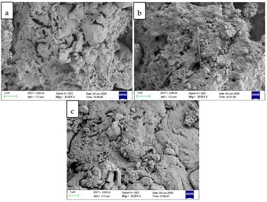 Figure 4 shows SEM images of chitosan, FMWCNT–chitosan, and NMWCNT–chitosan nanocomposite materials. The surface of chitosan shows a rough and dense texture with a compact arrangement. Small granular formations are evident, suggesting a spongy surface. This morphology is advantageous for adsorption because it offers a greater number of sites for interactions with contaminants. The image in Figure 4b reveals fibrous structures, indicating the presence of carbon nanotube materials. These fibres appear to be more open and less tight, implying increased porosity. This fibrous network can improve the efficiency of adsorption by allowing tetracycline to penetrate the material’s structure more effectively. The image in Figure 4c indicates that the surface exhibits rough and fibrous morphologies. The fibrous network contributes to mechanical stability and improved porosity, while the granular structure increases the available surface area. Together, these features enhance tetracycline adsorption through greater contact opportunities and molecular accessibility, as noted in the literature [,]. Additionally, the introduction of NMWCNTs to chitosan improved the surface of the chitosan structure, although not as highly as FMWCNTs.