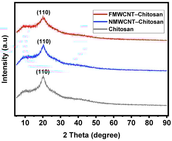 Figure 5 shows the XRD patterns of chitosan, FMWCNT–chitosan, and NMWCNT–chitosan nanocomposite materials. The broad diffraction of chitosan with 2θ values of 20.0° indicates the amorphous state of chitosan. Since only 1% of FMWCNTs and NMWCNTs were introduced to chitosan, the peaks of these composites only slightly broadened with few visible changes in structure. These chitosan nanocomposites exhibited a peak around 20°, associated with the (110) plane, suggesting that the crystalline properties are retained within the composite materials []. In the FMWCNT–chitosan composite, this peak becomes significantly broadened and reduced in intensity, suggesting that the incorporation of FMWCNTs disrupts the ordered crystalline structure of chitosan and increases the amorphous character of the material, potentially increasing the surface area []. This reduced crystal system likely facilitates improved adsorption by enhancing molecular diffusion and exposing more active sites.