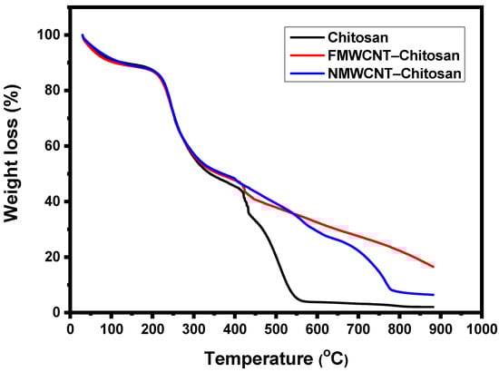 TGA curves of chitosan, FMWCNT–chitosan, and NMWCNT–chitosan nanocomposite materials.