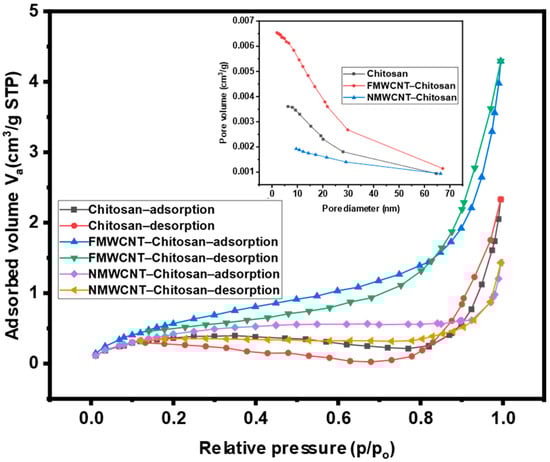 The adsorption capacities of the nanocomposites were evaluated using N2 adsorption–desorption measurements. Figure 7 presents the nitrogen adsorption–desorption isotherms of chitosan, FMWCNT–chitosan, and NMWCNT–chitosan. Among these, FMWCNT–chitosan exhibited a distinctly higher nitrogen uptake, indicating enhanced porosity. According to the IUPAC classification, all the isotherms corresponded to Type IV profiles with H3 hysteresis loops, characteristic of mesoporous materials with slit-shaped pores and diameters ranging from 2 to 50 nm [].