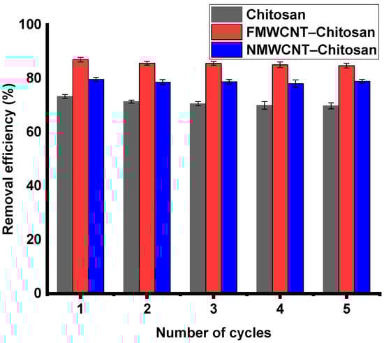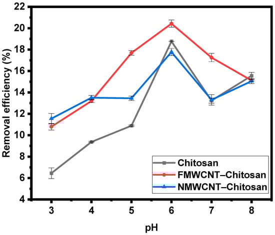 The BET data for chitosan, FMWCNT–chitosan, and NMWCNT–chitosan nanocomposite materials are presented in Table 2. The BET data show that the chitosan had a lower surface area and pore volume; however, upon modification with either FMWCNTs or NMWCNTs, the surface area increased. Chitosan blending with FMWCNTs showed a greater increase in surface area (2.3882 m2/g) compared to chitosan blending with N–doped MWCNTs (1.6836 m2/g). It is suggested that the observed increase in the surface area of FMWCNT–chitosan resulted from improved interfacial interactions between the FMWCNTs and the surface of chitosan. The change in BET surface area is as follows: FMWCNT–chitosan > NMWCNT–chitosan > chitosan. The increase in surface area can be attributed to the formation of pores due to the incorporation of NMWCNTs, which is further enhanced by the addition of FMWCNTs to the chitosan compound as noted in the literature. The BET results correlate with the adsorption studies reported in Section 3.2 wherein the nanocomposite with the highest surface showed the highest adsorption of tetracycline in water samples.