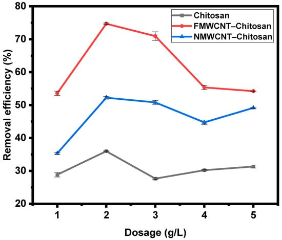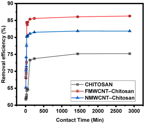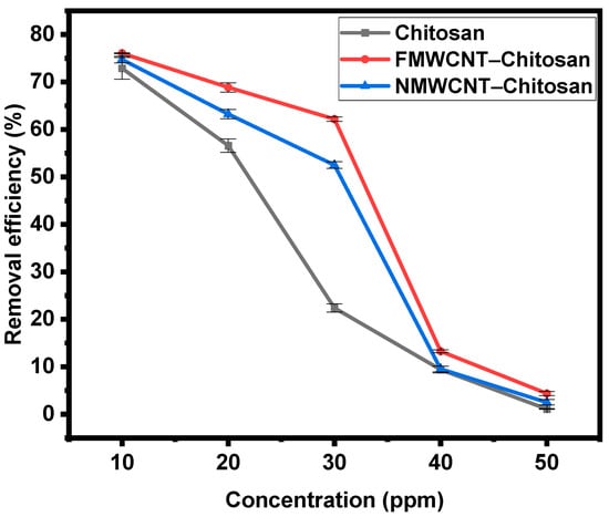 The adsorption efficiency of chitosan can be significantly enhanced by integrating it with nanomaterials such as multi-walled carbon nanotubes (MWCNTs) due to their high surface area, excellent electrical and thermal conductivity, high mechanical strength, and the capability to be functionalised for specific water contaminant removal [,,]. Furthermore, doping multi-walled carbon nanotubes with nitrogen offers numerous benefits in water treatment, mainly due to their improved adsorption capacity and catalytic activity []. By combining the natural adsorptive qualities of chitosan with the large surface area and stability of the nanoparticles, the chitosan-based nanocomposites are more efficient in removing pharmaceutical pollutants from aqueous environments [,].