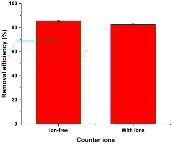 The effect of ionic strength on the adsorption performance of the best-performing composite, FMWCNT–chitosan, was investigated under conditions designed to simulate real water matrices. The experiment was carried out at pH 6, with an adsorbent dosage of 2 g/L, a contact time of 30 min, and a temperature of 25 °C, using a 10 ppm tetracycline solution containing sulphate (50 mg/L), nitrate (5 mg/L), and chloride (60 mg/L).