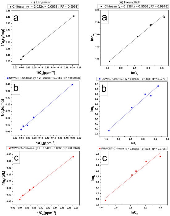 (i) Langmuir isotherm adsorption and (ii) Freundlich isotherm of (a) chitosan, (b) NMWCNT–chitosan, and (c) FMWCNT–chitosan on the adsorption of tetracycline.