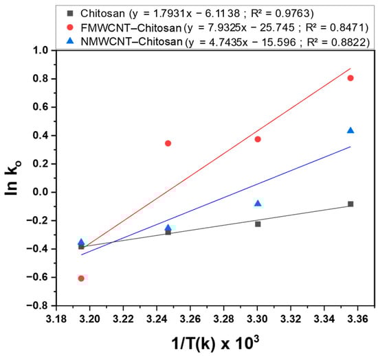 Thermodynamic analysis is used to examine the spontaneity, ability, and heat of tetracycline adsorption and the values of the thermodynamic parameters are key indicators of process applicability []. Thermodynamic characteristics under ideal circumstances were determined using the amounts of tetracycline adsorbed onto the adsorbent surface at various temperatures (25, 30, 35, and 40 °C) and plotted in Figure 17. Based on the slopes and intercept of the Van’t Hoff plot, as illustrated in Figure 17, the Gibbs free energy (ΔG°), standard enthalpy (ΔH°), and standard entropy (ΔS°) for chitosan, FMWCNT–chitosan, and NMWCNT–chitosan composite membranes were calculated and are summarised in Table 5.