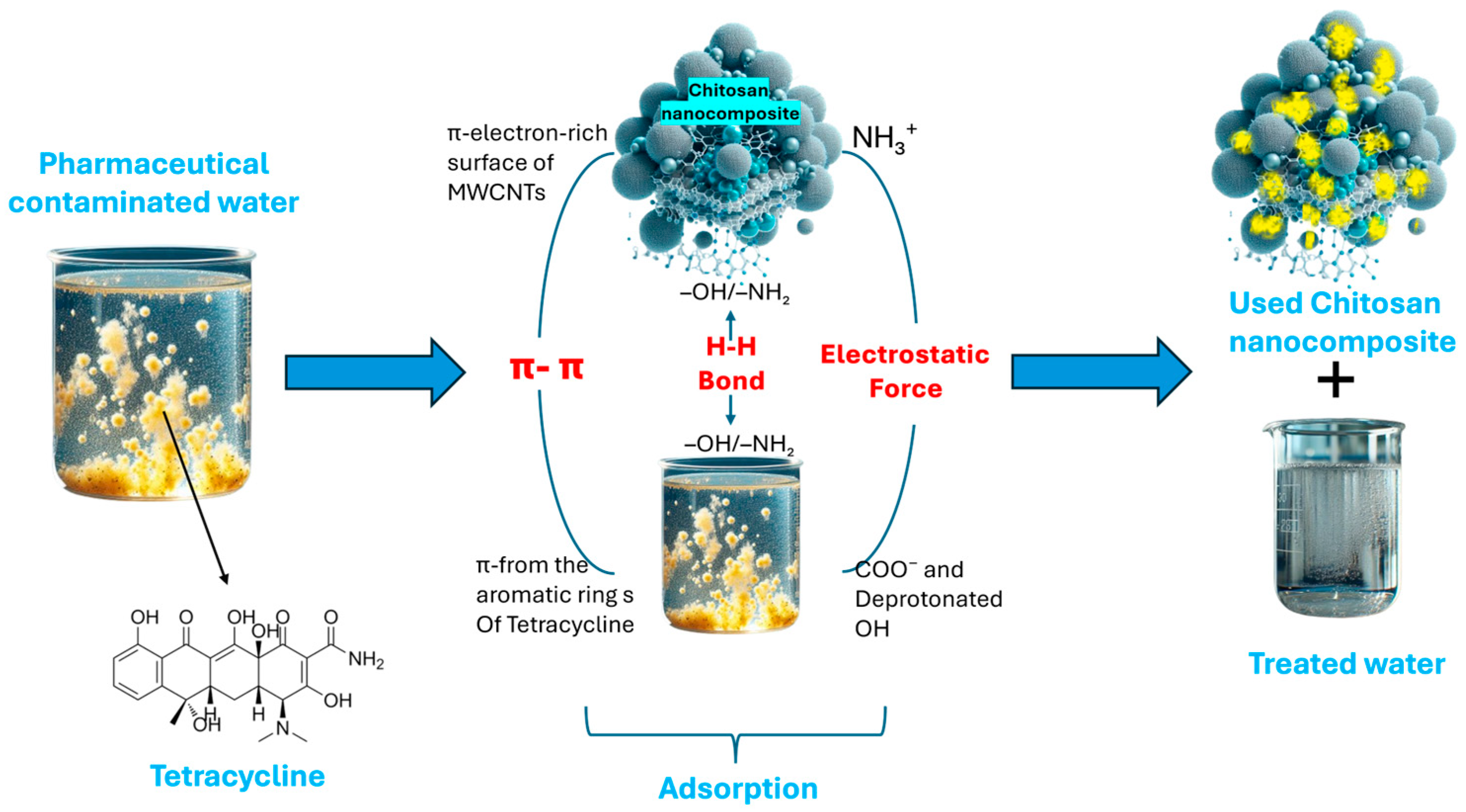 Kgoete, M.S.; Mokgohloa, C.P.; Macevele, L.E. Synthesis of Chitosan Nanocomposite Materials Grafted with MWCNTs for the Removal of Tetracycline Pharmaceutical from Water Samples. Colloids Interfaces 2025, 9, 69. https://doi.org/10.3390/colloids9050069