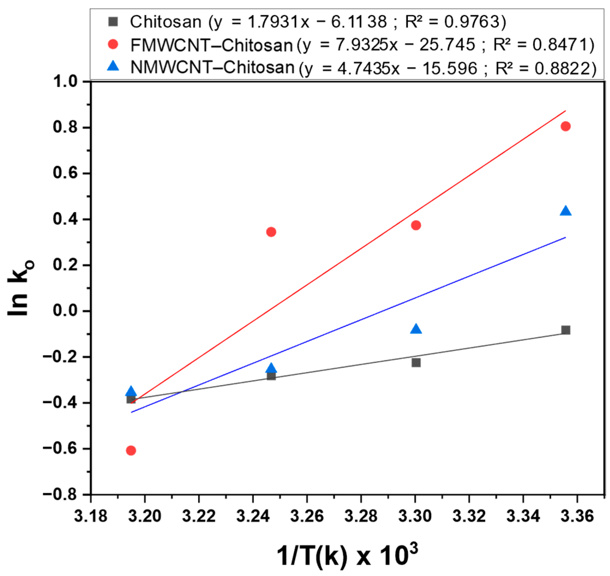 NMWCNT–chitosan | 298 303 308 313 | −1.072 0.206 0.646 0.920 | −0.0394 | −129.67 |