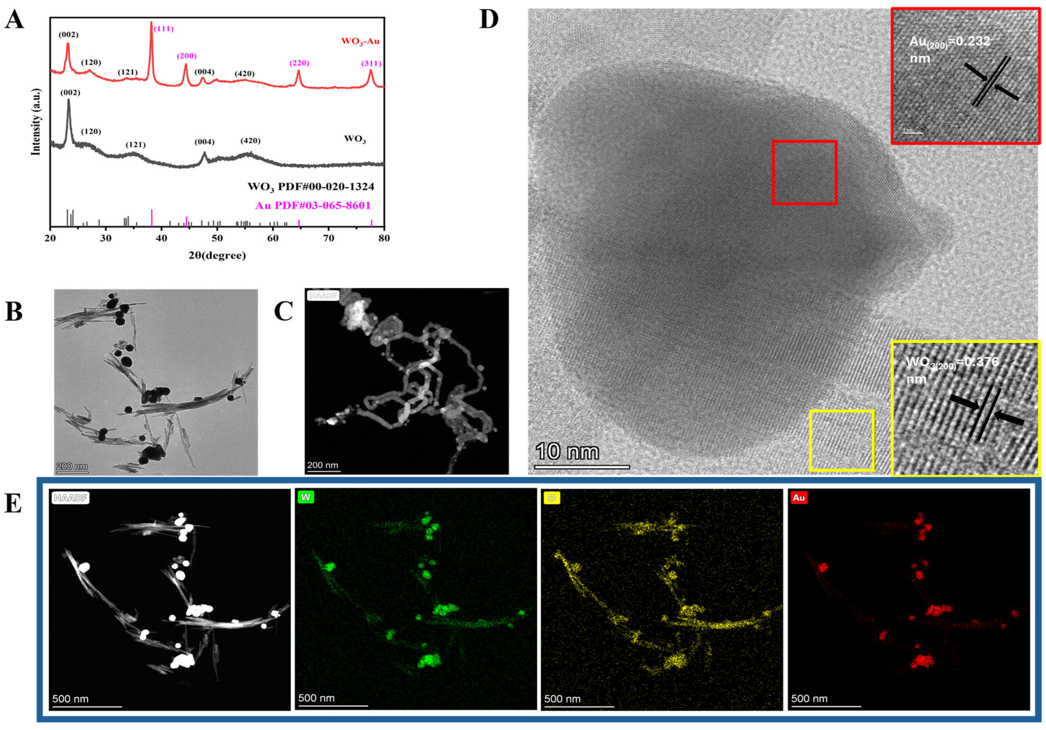 3.1. Morphology and Characterization of WO3 and Au/WO3