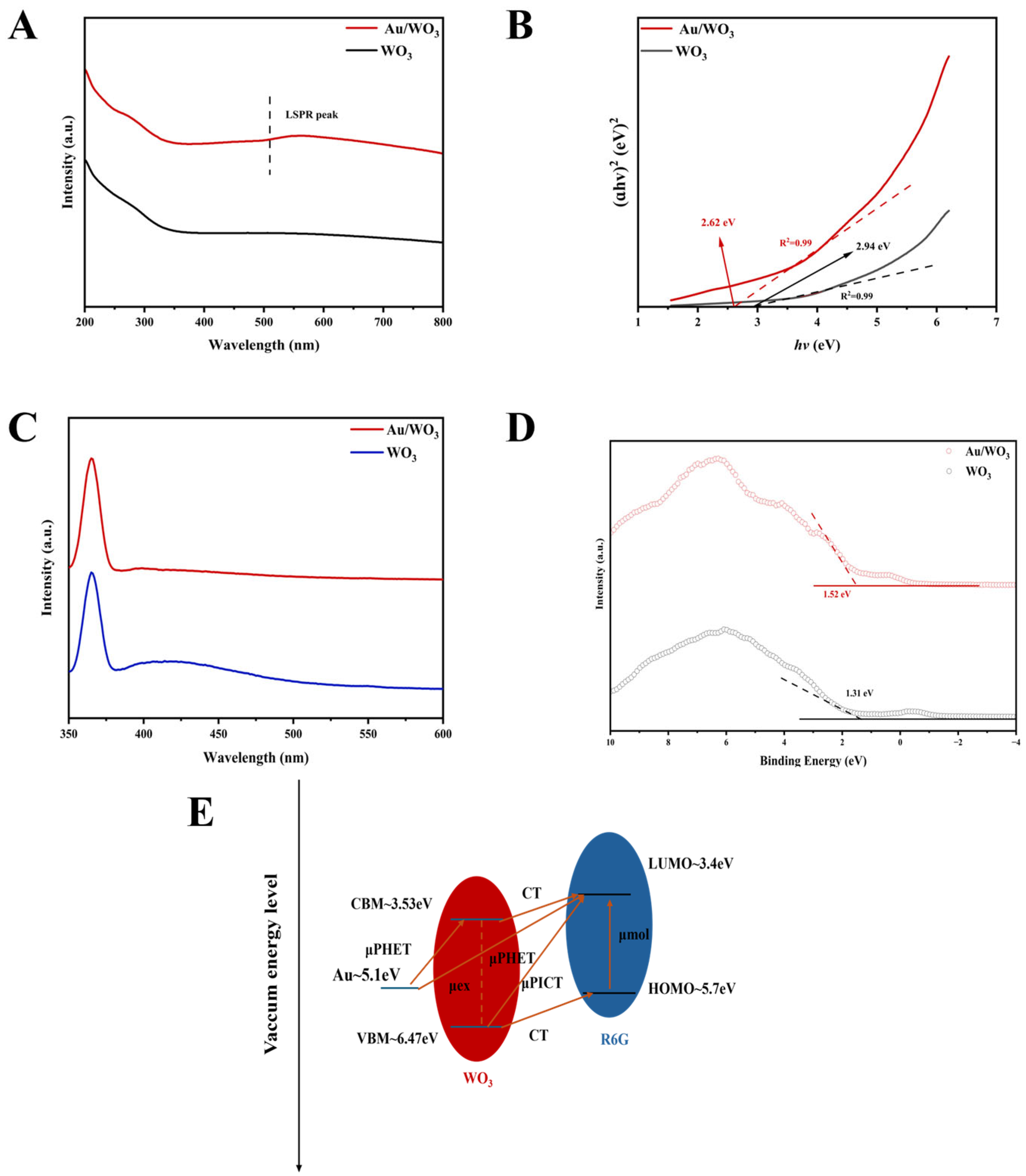 3.2. SERS Performance of WO3 and Au/WO3 SERS Substrates