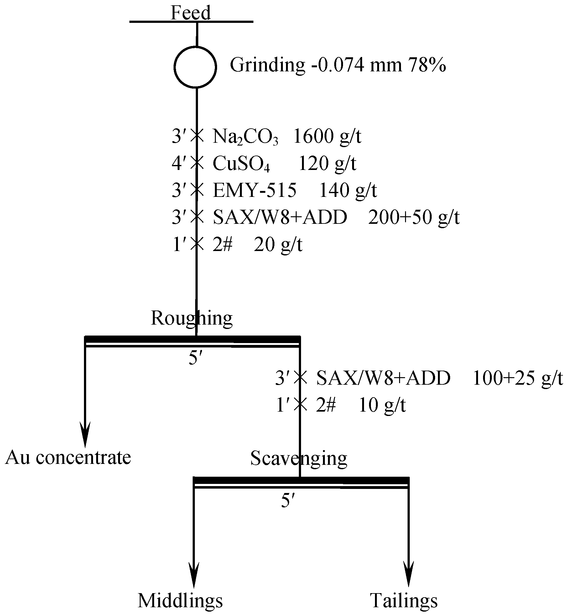 4 was used as the activator of Au-bearing sulfide minerals; SWUST-D01 (polysaccharide) was employed as the depressant; SAX + ADD or W8 + ADD was used as the collector; and 2# oil (industrial products of terpineol) was used as the frother. The condition time for each step and the reagent dosage are shown in