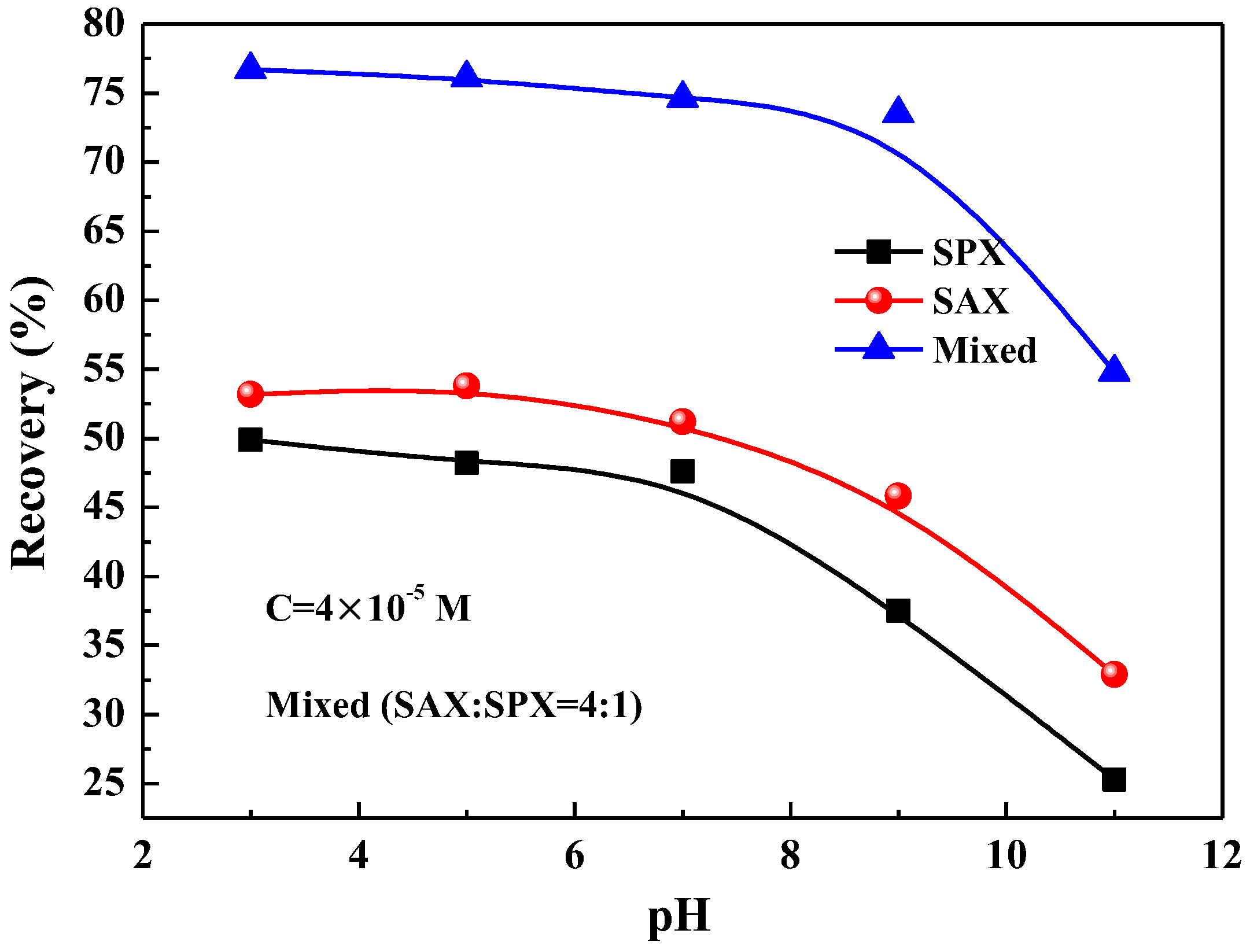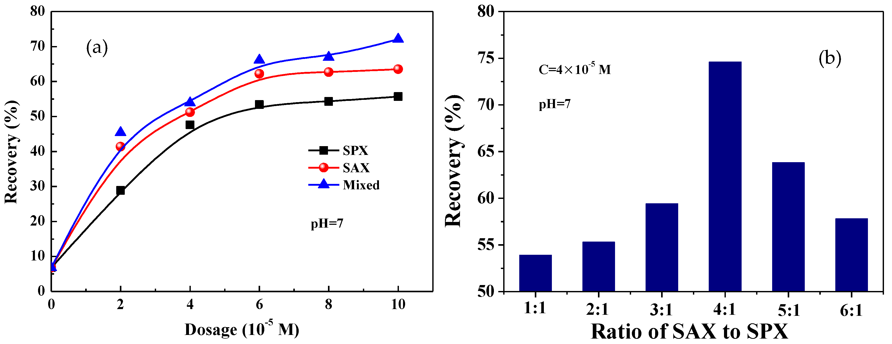 When used individually, SAX generally demonstrated better collecting power than SPX. Both collectors reached their maximum flotation efficiency at a dosage of 6 × 10