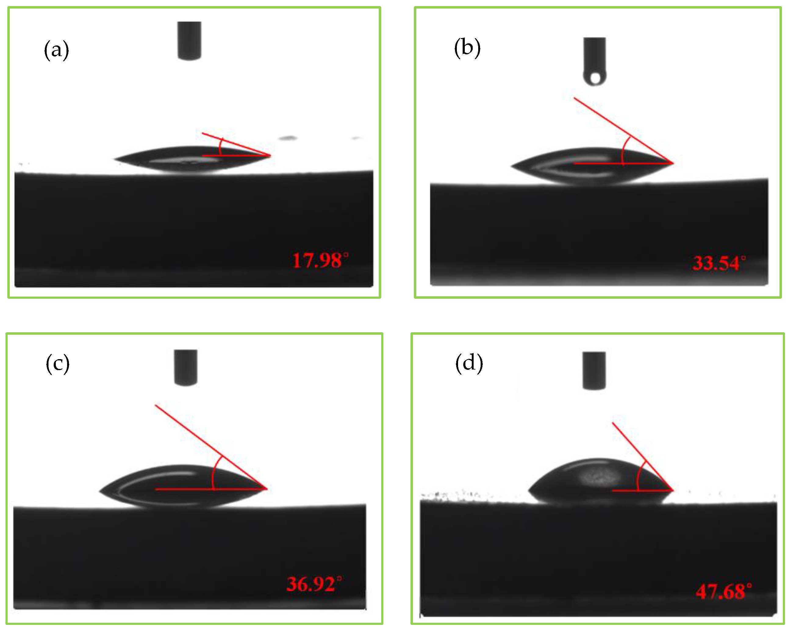 25]. A smaller contact angle indicates better wettability (i.e., poorer hydrophobicity), while a larger angle indicates poorer wettability (i.e., better hydrophobicity). The flotation process relies heavily on the wettability of specific mineral surfaces in the pulp. For instance, the adsorption of collectors onto valuable mineral surfaces inevitably reduces their wettability, whereas the interaction of depressants with gangue minerals increases it [