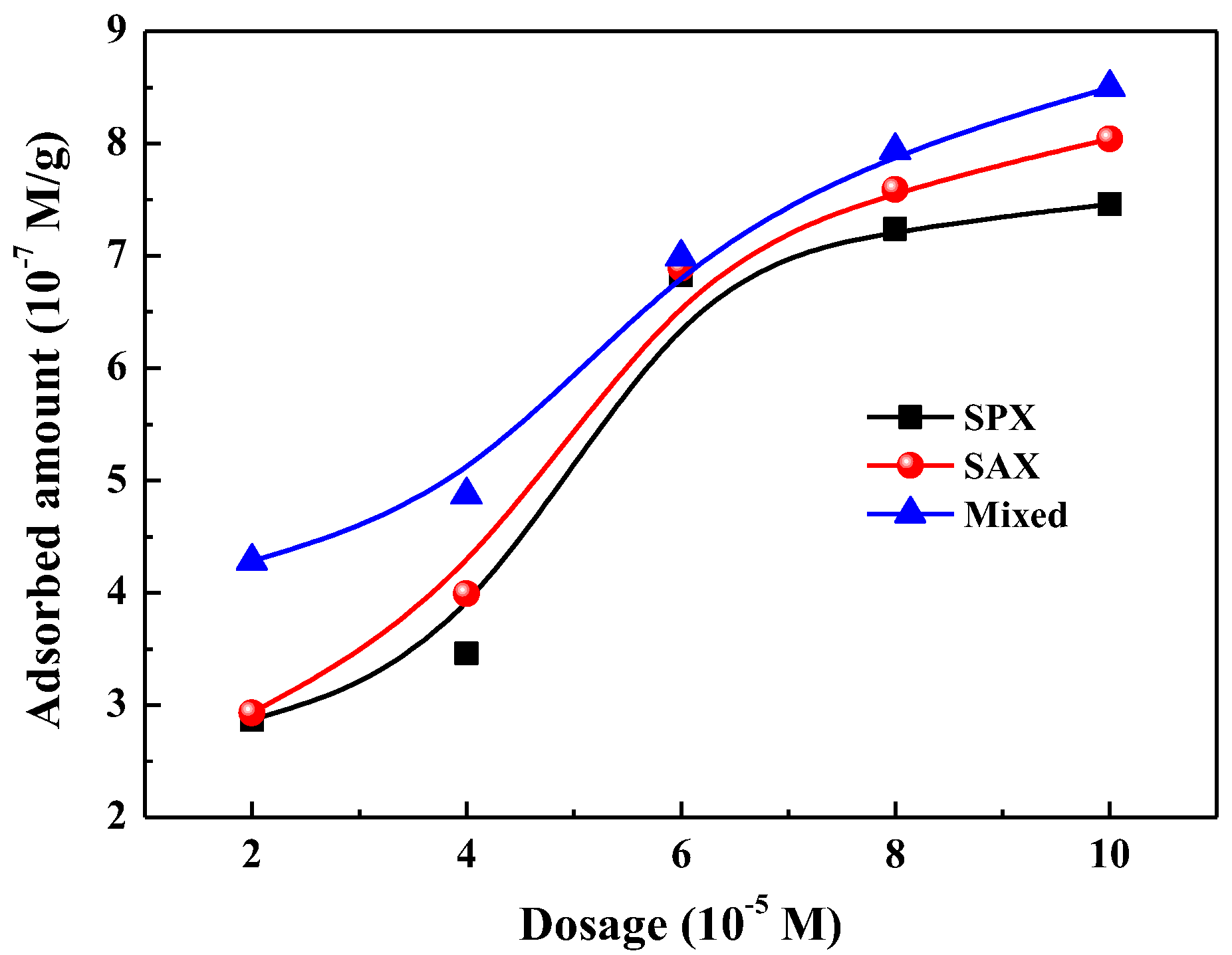 When SPX and SAX were used in combination (Mixed, mass ratio 1:1), a noticeable improvement in recovery was observed. That is, replacing part of the long-chain SAX with short-chain SPX resulted in better flotation performance than using SAX alone. This finding contrasts with the conventional understanding that longer-chain collectors typically exhibit superior performance when used individually and instead indicates a synergistic interaction between short-chain SPX and long-chain SAX in the mixed system, enhancing the flotation recovery of arsenopyrite [