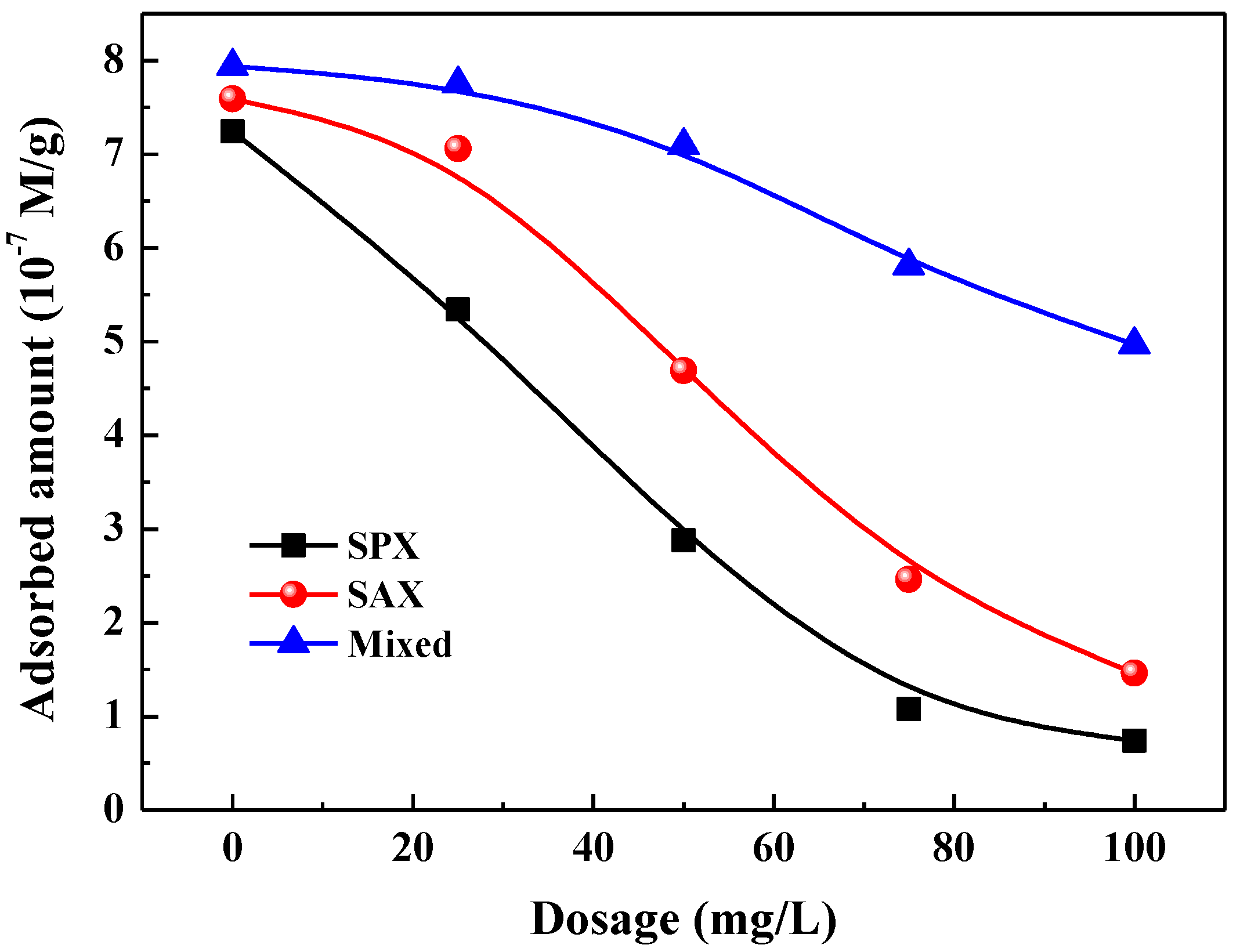 (II) A distinct synergism exists between SPX and SAX (1:4 mass ratio) in W8. This synergism boosts arsenopyrite recovery (73.5% at pH 9, vs. 37.5% for SPX and 45.8% for SAX) and enhances depressant resistance: under 100 mg/L depressant, the mixed system maintains 4.97 × 10−7 mol/g adsorption, much higher than single collectors.