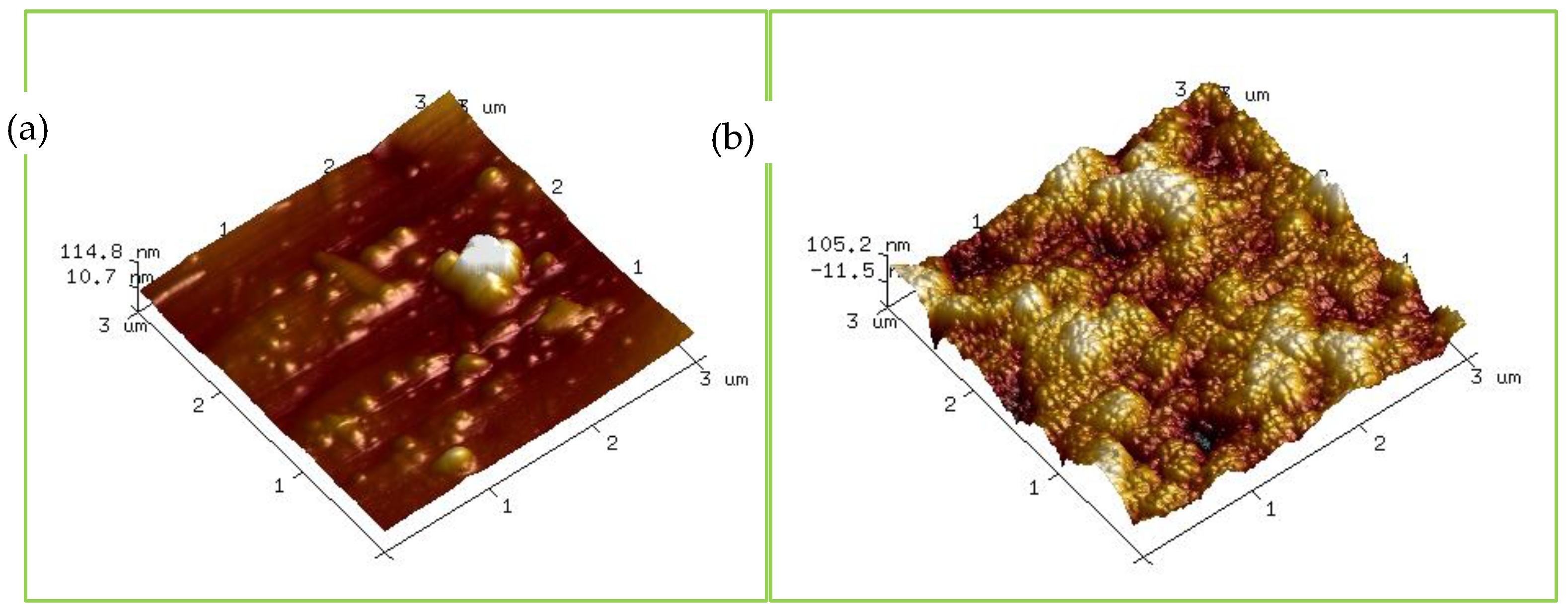 Figure 10b presents the surface topography of arsenopyrite treated with the mixed SPX/SAX collector system. It can be observed that large areas of the surface are covered with prominent protrusions resulting from the adsorption of collector aggregates. The maximum height measured is 105 nm, and these features are widely distributed across the surface, accompanied by a significantly higher roughness of 28.95 nm. This suggests a greater number of adsorbed molecular aggregates in the mixed system [