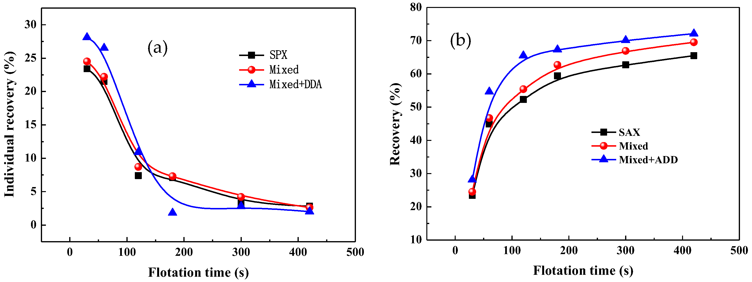 34]. In actual production, it was also observed that the W8 flotation reagent, when combined with ADD, provides a significant advantage in flotation rate over the conventional amyl xanthate + ADD collector system (greater amount of froth in roughing stage). To further investigate this, the present study subsequently examined the flotation rates of a single SAX system, a Mixed (SPX + SAX, 1:4) system, and a Mixed + ADD system—the latter was prepared by combining the aforementioned Mixed collectors with ADD at a 1:1 ratio, based on the previously established interfacial chemistry findings.