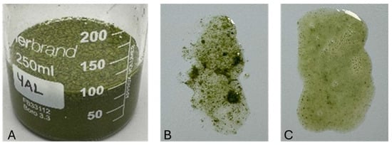 Initial dispersion of AA powder in water using a magnetic stirrer at 700 rpm resulted in poor homogenization, with visible aggregation and flotation of powder particles (Figure 4A,B). According to Gottschalk [27], clumping or flocculation can occur when the surface charges of the powder lead to stronger attractive forces than repulsive ones, resulting in particle aggregation. In addition, variations in density may lead the powder particles to cluster together and rise to the water’s surface instead of sinking to the bottom. In contrast, blending with a high-speed kitchen blender (≈13,000 rpm) produced a more uniform and viscous suspension (Figure 4C). The enhanced dispersion is attributed to the higher shear forces generated during blending, which effectively break down agglomerates and distribute particles evenly throughout the medium.