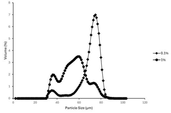 Overall, higher AA concentrations were associated with smaller mean droplet sizes. This trend aligns with findings reported in other studies which observed similar effects with increasing surfactant concentrations on emulsion droplet size distribution [43,44]. For emulsions prepared using the high shear lab mixer (Figure 11), the 1% AA suspension exhibited a dominant, sharp peak at a smaller particle size (D50 = 31.23 ± 0.95 µm) compared to the 0.1% AA suspension (D50 = 61.78 ± 3.06 µm). In the case of blender-prepared emulsions (Figure 12), although a dominant peak was not observed for the 1% AA emulsion, the majority of particles fell within a smaller size range relative to the 0.1% AA emulsion.