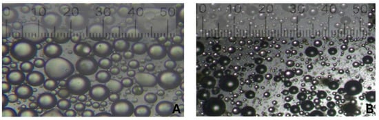 Microscopy images of oil-in-water emulsions for AA mass concentration of (A) 0.1% and (B) 1% prepared using the blender.