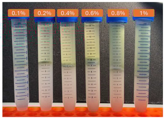 To assess stability, samples were centrifuged at 4000× g for 5 min at designated time points: fresh, 1 day, 2 weeks, and 4 weeks. The heights of the separated layers were measured (Figure 3), and EC and ES were calculated using modified equations from Cooper & Goldenberg [26] (1) and (2).