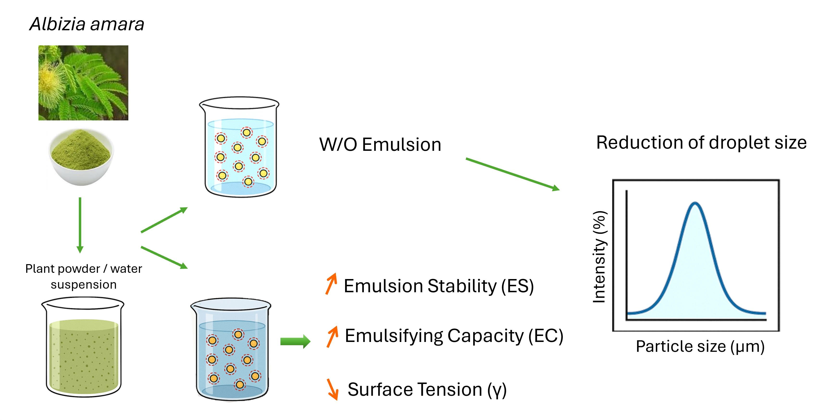 This study aims to evaluate the feasibility of using raw AA powder suspended in water as a plant-derived surface-active material, without prior extraction. Specifically, the research focuses on assessing the apparent surface tension reduction, oil-in-water emulsion particle size, and identifying the most effective method for preparing uniform and stable AA suspensions. The findings will contribute to understanding the emulsifying potential of AA and its suitability as a natural alternative to synthetic surfactants.