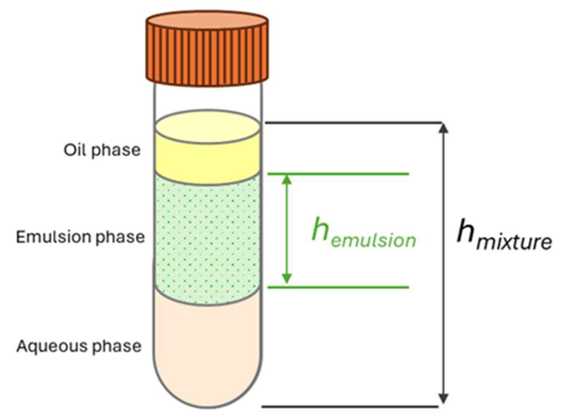 where hemulsion is the height of emulsion phase while hoil is the height of oil phase. hoil was assumed to be half of the total liquid height hmixture. For ES measurement, the height of emulsion phase of the 4-week aged sample, hemulsion,4week was compared to the height of emulsion phase of the fresh sample, hemulsion,fresh. The experiment was repeated three times to obtain an average and standard deviation.