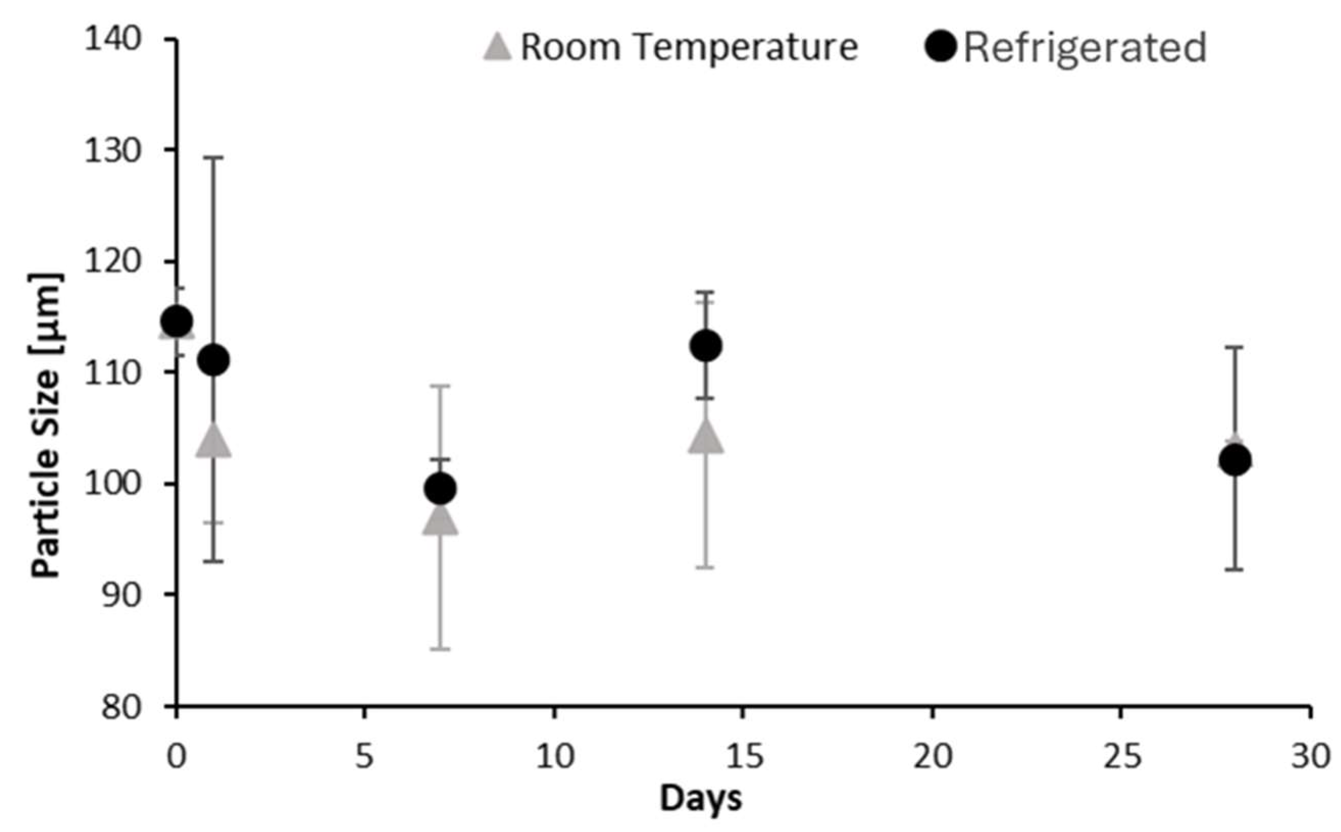 Over time, particle size varied depending on storage conditions. As shown in Figure 7, suspensions stored at room temperature displayed greater variability and wider error bars, suggesting increased aggregation or sedimentation. In contrast, refrigerated samples showed narrower error bars and more consistent particle sizes, likely due to reduced Brownian motion [30] and lower kinetic energy, which minimize particle collisions and aggregation.