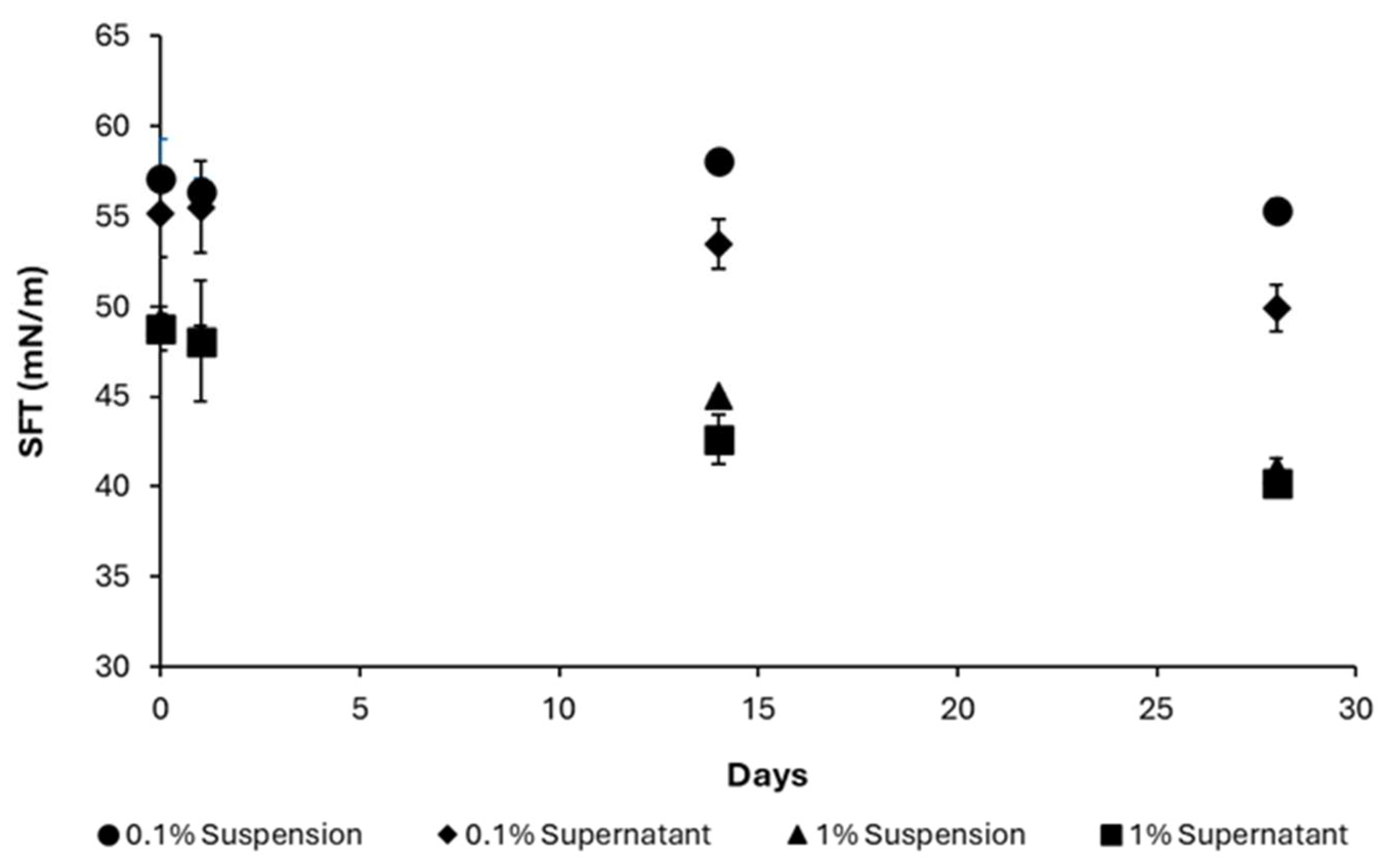 The temporal variation in apparent surface tension over a 28-day period for both AA suspensions and their corresponding supernatant layers at concentrations of 0.1% and 1% (Figure 9). A progressive decline in apparent surface tension was observed across all samples. Specifically, the apparent surface tension of the 0.1% AA suspension decreased from 57.13 ± 2.17 mN/m to 55.35 ± 0.64 mN/m, while the 1% AA suspension showed a more pronounced reduction from 49.17 ± 0.36 mN/m to 40.95 ± 0.64 mN/m over the same period. Notably, the supernatant layers exhibited greater apparent surface tension reduction than the suspensions, particularly at 0.1%, where values declined from 55.19 ± 2.44 mN/m to 49.90 ± 1.33 mN/m.