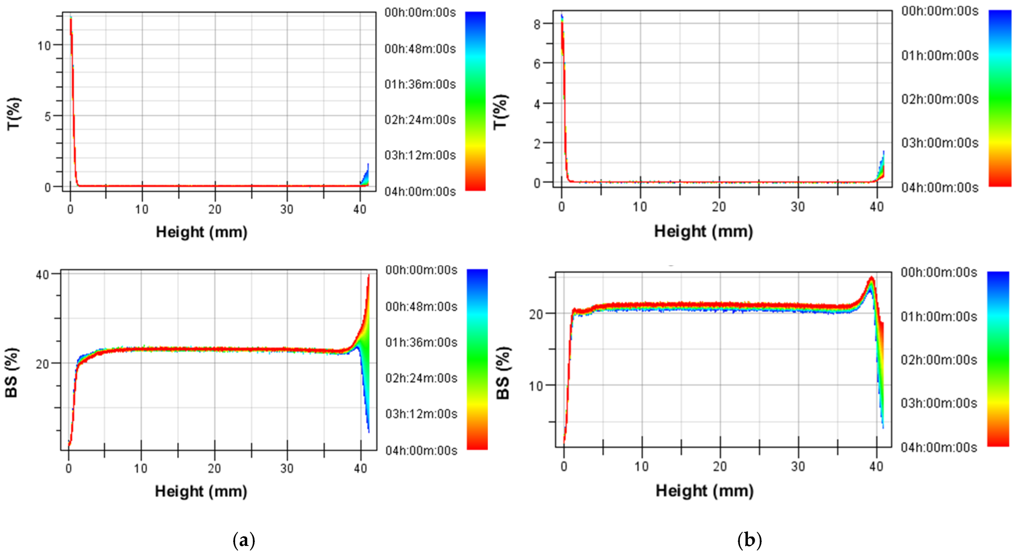 The experimental phase of this work focused on optimizing the formulation of stable, low-concentration emulsions. A series of tests was performed to assess emulsion stability and identify the emulsifier content that ensures maximum colloidal stability of the dispersed system. The destabilization kinetics of the formulated emulsions were analyzed using a Turbiscan LAB stability analyzer. Turbiscan LAB is capable of detecting very small changes. A signal change of ±0.1–0.2% is often considered the threshold for significance.