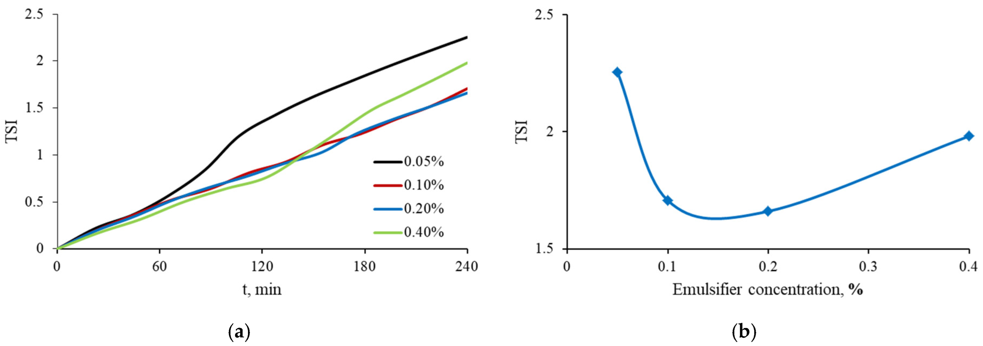 In this study, a series of experiments was conducted to monitor the change in TSI over time for emulsion samples with varying emulsifier concentrations. The resulting kinetic curves clearly demonstrate the influence of emulsifier content on the system’s destabilization rate. Analysis of the data presented in