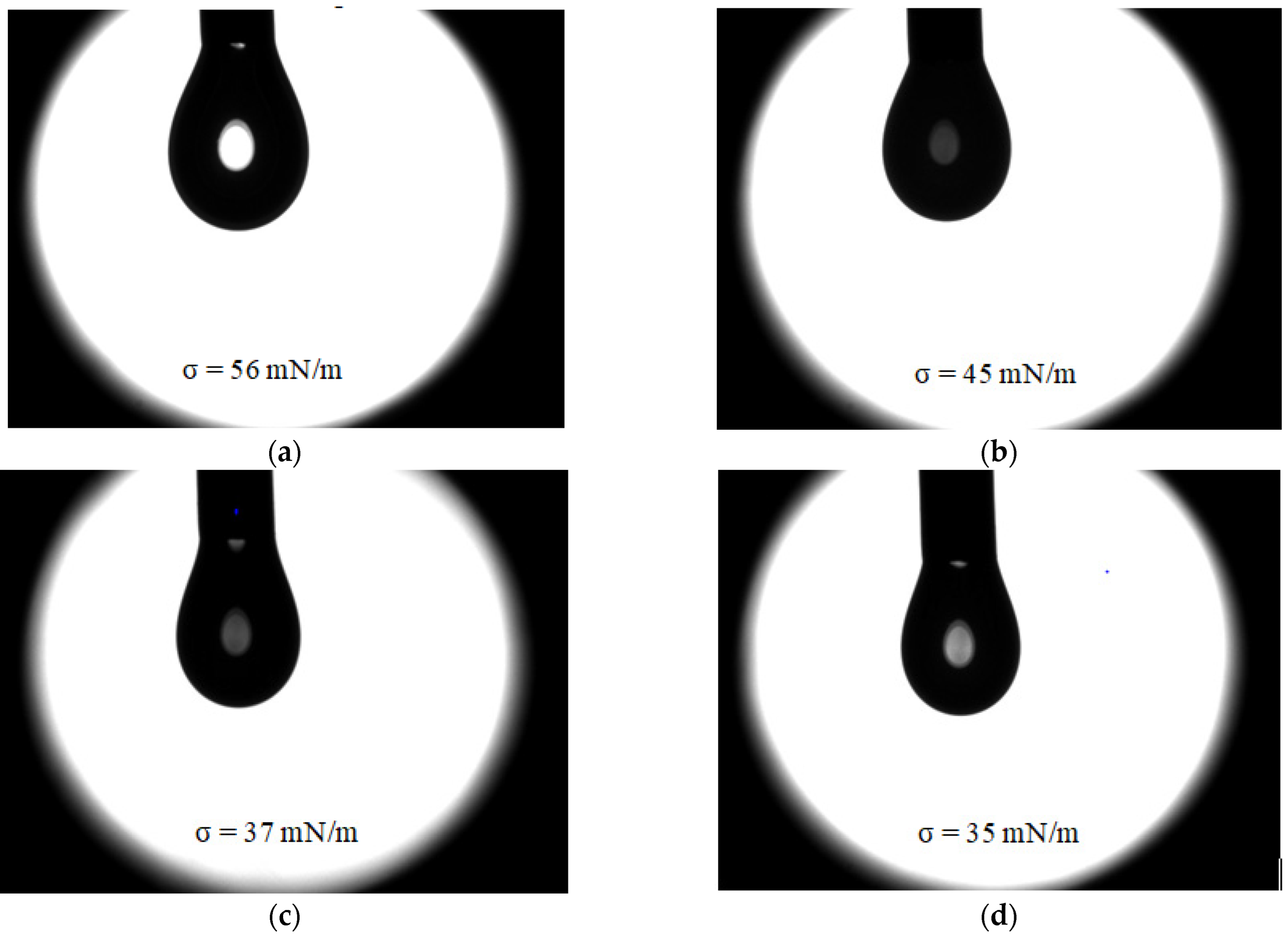 The surface tension of the studied nanoemulsions was measured by the “Pendant Drop” method. The photos is shown in