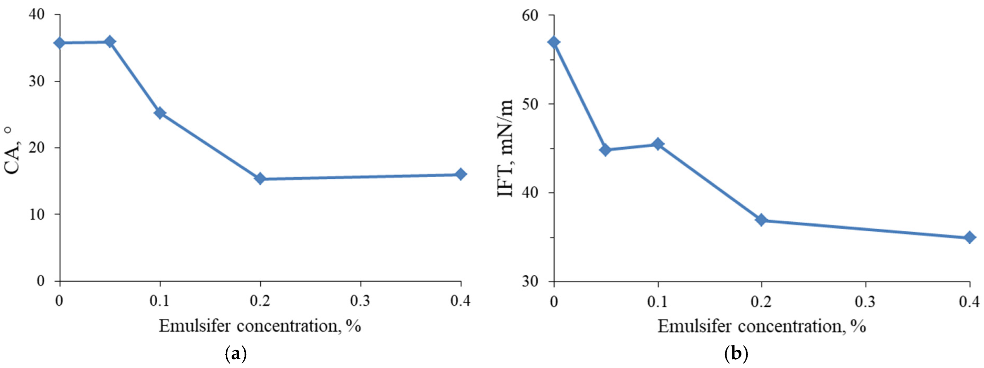 Figure 7 shows the final average values of the dependence of the surface tension coefficient and the contact angle of quartz glass plates with nanoemulsion on the emulsifier content, measured by the pending and sessile drop method. With an increase in the concentration of the emulsifier, the wettability of the emulsion is shown to improve. The wetting angle decreased from 35° to 16°, indicating a favorable shift towards water-wetting conditions that enhances oil detachment from the pore walls. Furthermore, the IFT was reduced by nearly half, which also promotes more efficient oil displacement.